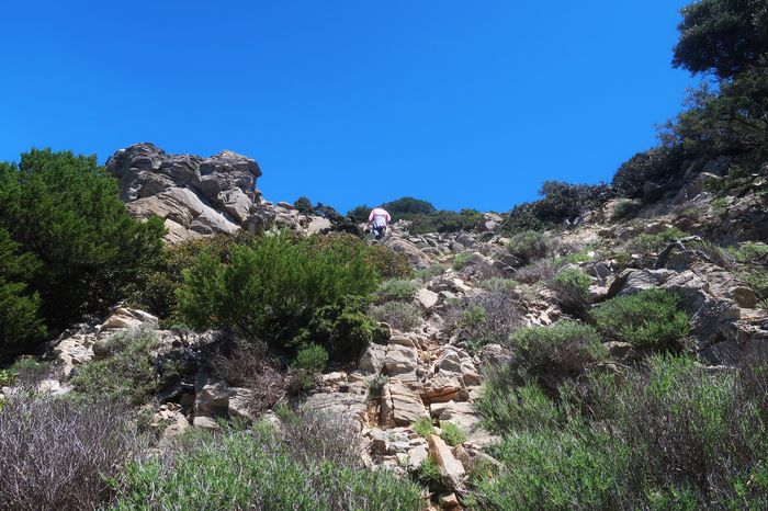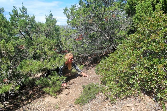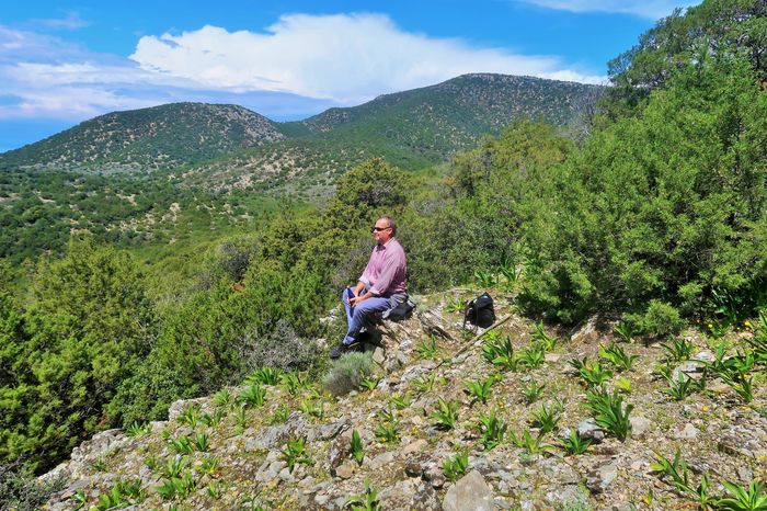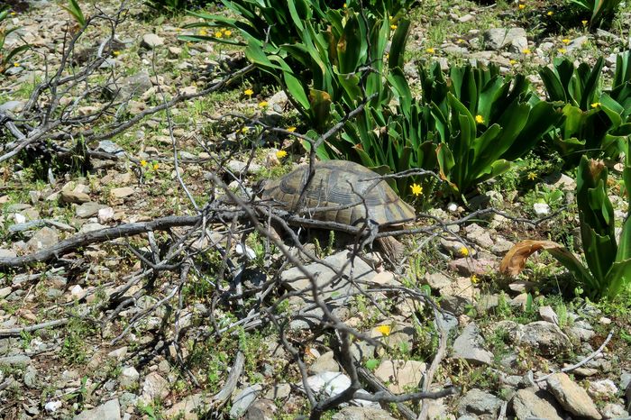 I en snårig och brant terräng kämpade vi oss upp mot toppen. En landsköldpadda höll på att äta blomblad till lunch och vi fick ett fantastiskt möte med den lilla krabaten halvvägs upp. Helt orädd lät han oss komma nära så vi kunde fotografera. Hans sköld var så stor att hade han lämnat sitt hårda skal och flyttat ut, så hade den passat fint som cykelhjälm på någons huvud.