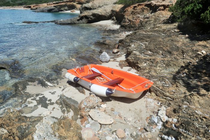 Vi hade bestämt oss för att utforska Megalonisos som är den största ön av de tio som tillhör Petalis skärgård. Efter att vi sovit ut och njutit av en härlig frukost i sittbrunnen så sjösatte vi jollen och laddade fikakorgen. Strax satt vi i dingen och Kapten tog rejäla tag med årorna över viken.