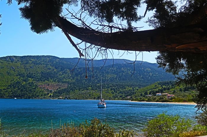 Vi är på den nordligaste delen av ön Evia, i en djup vik utan namn om man ska tro kartböcker och sjökort och här vi fått ankra på lite nytt vis. Vi brukar ankra på mellan tre och tio meters djup, helst med sandbotten och enligt skolboken ska man lägga ut ankarkätting/lina motsvarande minst tre gånger djupet. Själva lägger som regel ut fem gånger djupet eller mer för att vara på den säkra sidan. Att dragga är något vi aldrig upplevt, men inte heller vill.