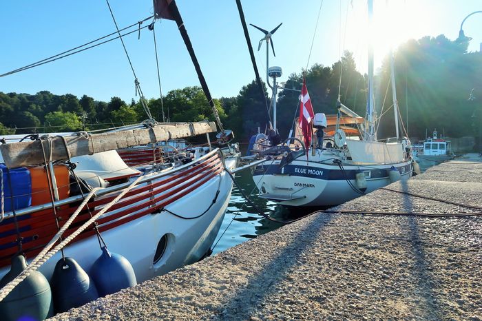 Men lite flax hade vi trots allt, för in i första viken på ön Skiathos innan solen helt gått ner, så fann vi en skyddande pir och vågbrytare där några lokala fiskebåtar höll till. Vi såg att det låg en segelbåt där och vi tänkte att med lite tur kanske vi också skulle få plats. Döm om vår förvåning när vi såg att det var våra danska vänner på segelbåten Blue Moon som sökt skydd för vågorna. Med knappt en segelbåtslängd tillgodo så la vi till akter om dem där Wilmas akter fick sticka ut utanför piren. Våra danska vänner har vi träffat vid två tillfällen tidigare så det blev ett glatt återseende.