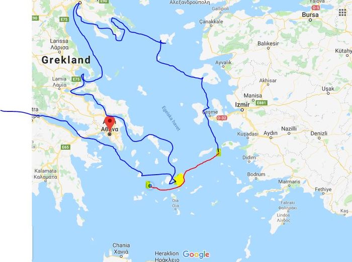 Vi har gjort en frisk och härlig förflyttning de senaste dagarna. I klapp-klapp-tempo med stopp i någon enslig vik för en kort nattvila har vi seglat västerut och korsat meltemi-korridoren på mitten av Egeiska havet där vi upplevde vindstyrkor på 18-20 meter per sekund. Endast en annan segelbåt såg vi till och när vi tog kontakt via radion fick veta hur mycket det blåste. För första gången någonsin (!) har vi revat Wilma och med endast det inre förseglet ute och ett rev intaget på storseglet så fick vi en fin balans på skutan och vi gjorde mellan sex och sju knop. Vi hade nog kunnat segla utan att reva men när båten lutar mer än 35 grader så tenderar väggarna bli golv och det blir svårt att röra sig ombord. Ingen ombord vill koka kaffe då och lusten till att spela Yatzy försvinner.