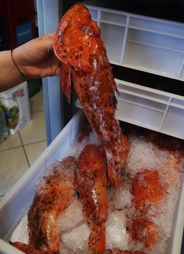 Vi ville inte missa chansen att insupa Faros härliga atmosfär så ena kvällen rodde vi in till fiskebåtskajen för att gå på restaurang. Vi blev varmt mottagna av personalen och vi fick ett bord på terrassen med vacker panorama ut över viken och Wilma. Den trevliga servitrisen föreslog att vi skulle följa med in och själva välja en nyfångad fisk. I en kylvagn med draglådor, en fisksort för varje låda, låg fiskarna på isbädd. Vi fick veta de olika fiskarnas namn samt hur de tillagas och vilken smak och struktur de ger. Priset anges per kilo vilket till en början verkar dyrt men som landar betydligt humanare i pris än vid första anblick, här får man in maten på ett gemensamt serveringsfat och inte som portionstallrikar som i Sverige. Vi föll för röd skorpionfisk, den såg spännande ut och utlovades ha likheter med hummern. Det lät mäkta gott och till fisken serverades en oliv- och citronsås. Förutom fisken beställde vi grillade grönsaker, tzatziki, bröd och vin.