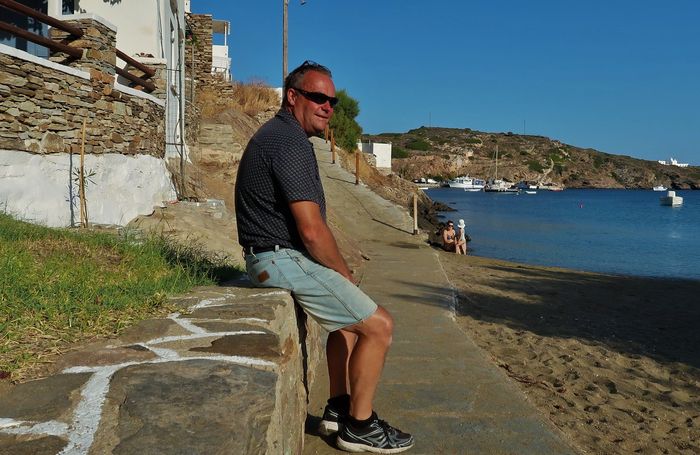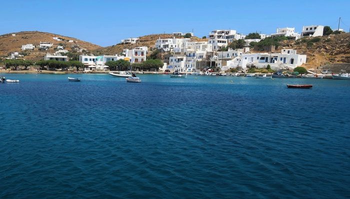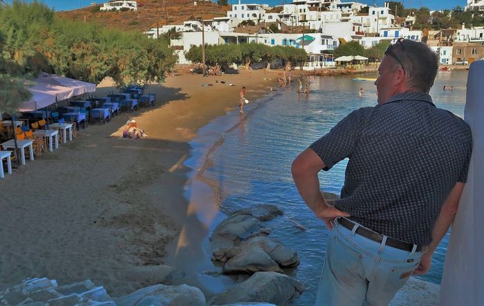 Faros är en bedårande liten fiskeby och en relativt okänd pärla belägen på öns sydöstra sida. Hit hittar få turister. De flesta är greker men en och en annan skandinav och fransman dyker upp här. Här finns inga krimskramsbutiker, inga parasoller i långa rader och inget hotellkomplex. Vill man besöka Faro så får man hyra något av de små vitkalkade sockerbitsformade husen med indigofärgade fönsterluckor som står intill vattnet. Eller så bor man inne i Apollonia, huvudorten på ön och tar bussen ut över dagen. Här finns vandringsleder som tar dig till närliggande badstränder eller till någon av de 365 kapellen som finns på ön. Ett kapell för varje dag på året som grekerna här säger. Faros bjuder på lata dagar med sol och bad. Soltrötta föräldrar söker skugga på tavernan där de har god uppsikt över sina barn som leker i vattnet, borden står precis intill brynet. Om kvällarna fylls restaurangerna av hungriga människor och fisk är det givna temat på menyn. Prisläget är något högre än vi är vana vid, men inte så man får hicka. Alla är mycket vänliga och tempot är lugnt. Pittoreskt och genuint. Lugnt, varmt och azurblått. Platsen ger oss en stark semesterkänsla trots vår arbetsfria tillvaro.
