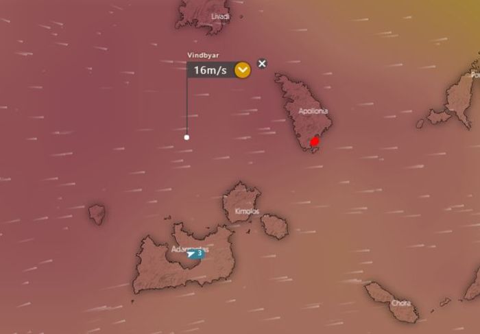 Igår morse gjorde vi oss seglingsklara. Vi var in till fiskehamnskajen för att fylla på färskvatten i våra dunkar. Tillbaka på Wilma så surrade vi och startade upp all navigation. Vår plan var att sätta kurs mot en ankarvik på den sydvästra sidan av Sifnos, det väntade för ovanlighetens skull sydostliga vindar till natten.