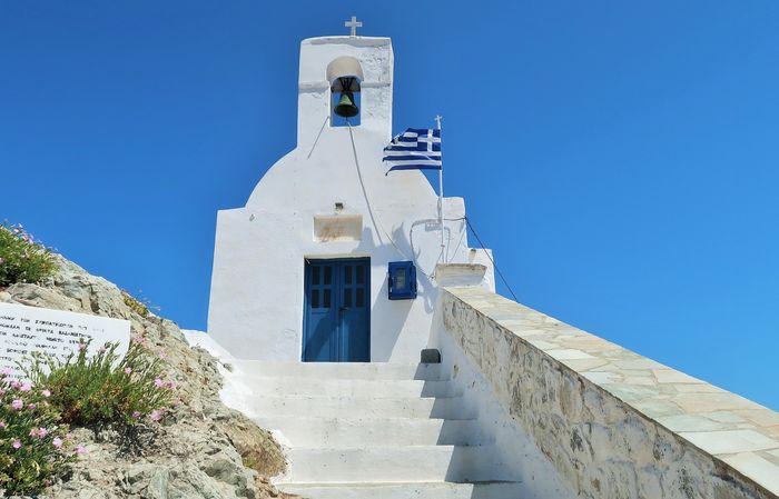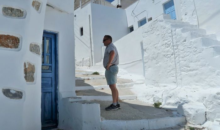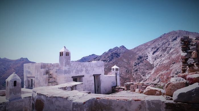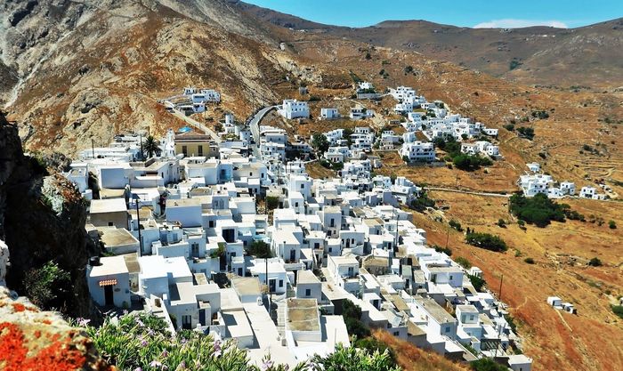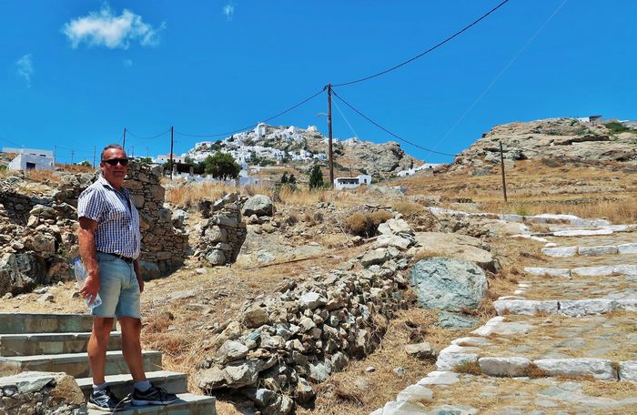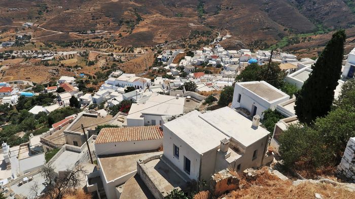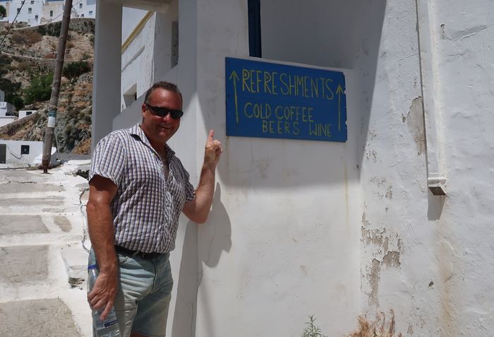 Att ta sig upp för berget tar närmare en timme om man stannar till ett par gånger och dricker vatten vid någon av posterna som kyrkan snällt ställt ut. Ett behövligt stopp för så väl åsna som man. Väl uppe så ser vi långt ut över Egeiska havet och de närmaste öarna i prefekturen Kykladerna. Vi ser ön Sifnos där vi nyss var och nedanför oss skymtar vi Wilma i det bortre hörnet av bukten. Bor man ett helt liv på toppen av Chora så har man sannolikt ett långt liv att vänta med dess friska luft och vardagsmotion som ges. Strax nedanför toppen finns ett torg, tillika Choras hjärta, med ett fik och en taverna samt stadshuset där öns administrativa ärenden sköts. Ja någon mer kommers går inte att finna förutom ett folklore-museum.