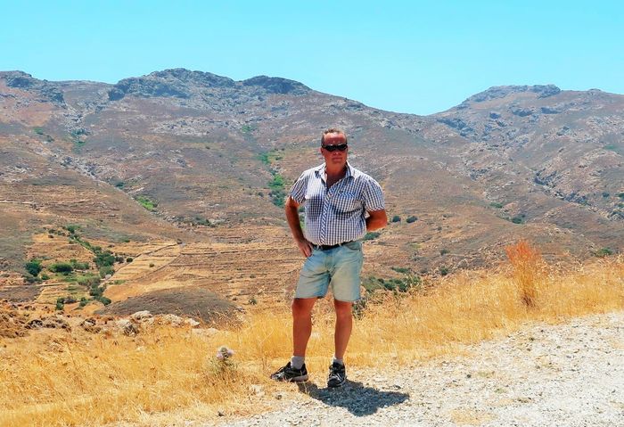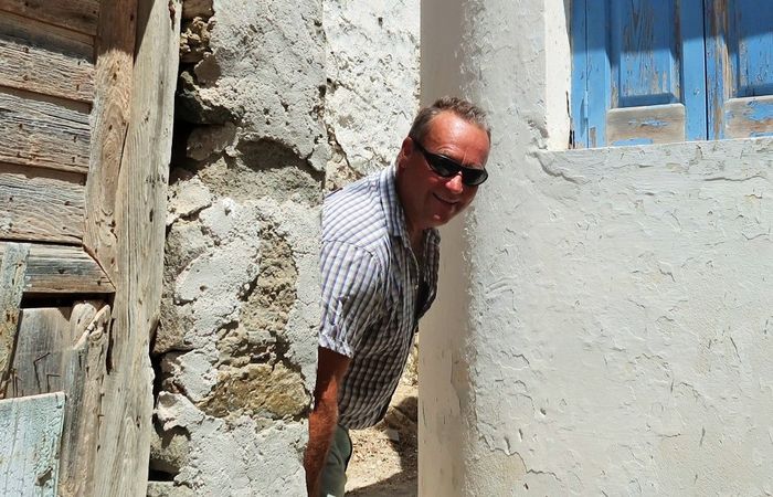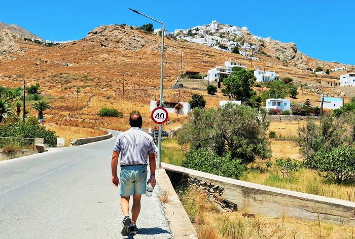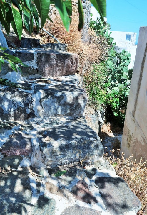 Vårt mål var att nå Chora, en vykortsvacker stilla by med hus som klätterlikt reser sig mot bergets topp och som avslutas med ett kapell på knallens högsta punkt. På toppen möts man av en svindlande utsikt över Livadibukten och dess by intill. Livadi har sexhundra invånare och en del turism om somrarna. I stillsamma Chora bor trehundra personer. Med bil kan man ta sig upp via den nyare vägen som likt en serpentin ringlar sig uppför och emellanåt korsar den åsnestig som vi kämpar oss upp via. Men tar man bil så får man parkera och gå sista biten oavsett, för den övre bebyggelsen erövras endast till fots eller ridandes på åsnerygg då vägarna övergår i stenbelagda gränder och trappor där vissa partier är svårbemästrade och får promenaden att mer likna en bergsklättning än någonting annat.