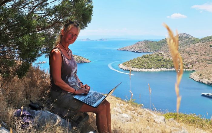 (…vi är på Hydra där vi finner internet uppe på berget intill…)