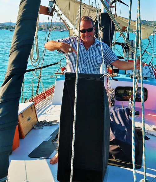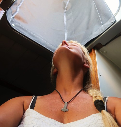 Senare hade Kapten gått ner i salongen för att sy en vindfångare (windscoop) till Wilma. Vi ville ha en till däcksluckan för att få luften att passera genom båten och på så sätt skapa ett skönt vinddrag till den svettiga besättningens stora lycka. Det är varmt nu, dag som natt. Medan Kapten satt och sydde som bäst så hördes plötsligt en hård smäll med en efterföljande svordom. BRAAAK! Nån hade kolliderat med Wilma och vi sprang båda upp för att se efter.