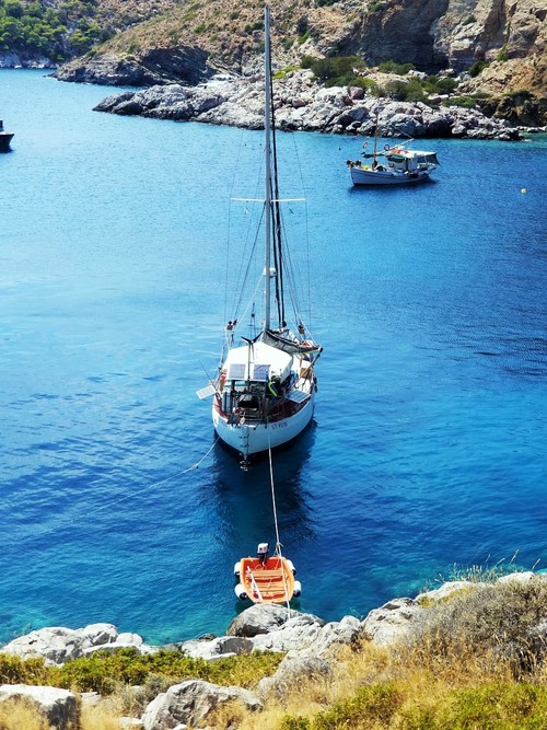 Under veckan vår vän var här så passade vi på att få såväl segling som fiske, snorkling och bad på schemat. Efter att ha stannat en natt i ankarviken vi tidigare skrev om, där vi drabbades av en getinginvasion och fick äta vår middag ute i jollen på fjärden, så seglade vi ner till ön Hydra. Vi gick tillbaka till exakt samma plats där vi var för ett par veckor sedan för att Konstruktören skulle få uppleva ett seglarliv i avskildhet, en välgörande detox utan uppkoppling mot omvärlden. I dagarna två tog vi jollen till en ren och orörd natur och vi förtöjde intill någon grotta där vi snorklade tills läpparna blev blå och fingrarna russin-lika. Bland spännande bergsformationer och skrevor under vattenytan fann vi ett landskap med häftiga fiskar, sjöborrar och växter. Ena dagen så tog vi jollen över till den lilla grekiska fiskebåten och köpte nyfångad red mullet som vi senare grillade på kvällen uppe på land bland klippblocken. En annan dag klättrade vi högt upp på berget intill ankarviken för att komma åt internet för att få en väderleksprognos och höra av oss till omvärlden. En timmes uppkoppling per dag räcker gott och väl för en seglare.