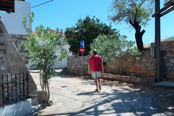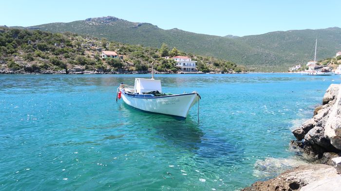 Här ligger den lilla fiskebyn Gerakas. Den mesta delen av kajen var redan upptagen av andra båtar när vi kom, fler än vi hade sökt skydd för svallen. Men vi fann en ledig plats längre in där djupet var mer osäkert. Vi droppade ankaret i mitten av floden och backade in mot kajen. Med några få meter kvar mot kaj så grundade det upp och vi slog rodret i sjöbotten, BONK – inte allvarligt för vi smög fram i den händelsen det skulle bli för grunt. Vi tyckte ändå att vi låg bra med ankaret och platsen och vi hade heller inte så många andra val, så vi förlängde akterlinorna och drog Wilma längre ut från kaj. Nu ligger vi här med ett för stort kliv för att kunna hoppa i land och vi använder jollen som linfärja mellan Wilma och fast mark.