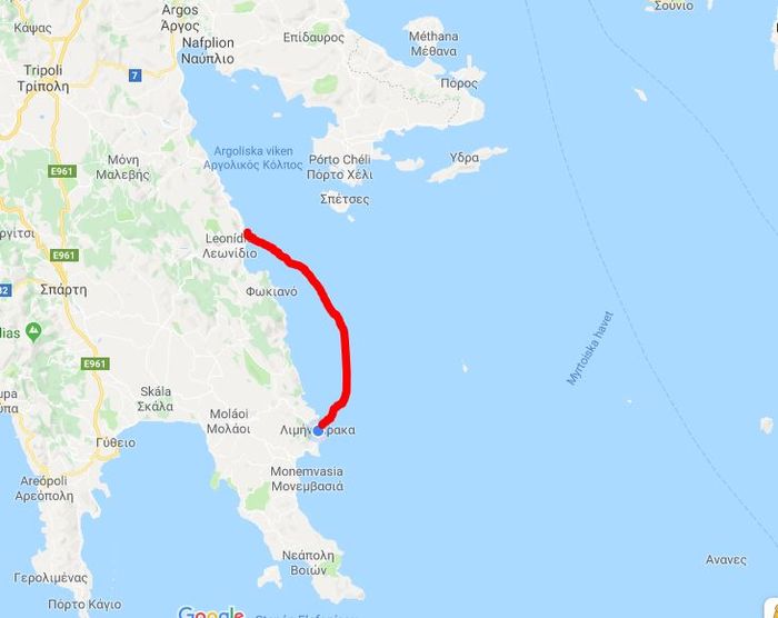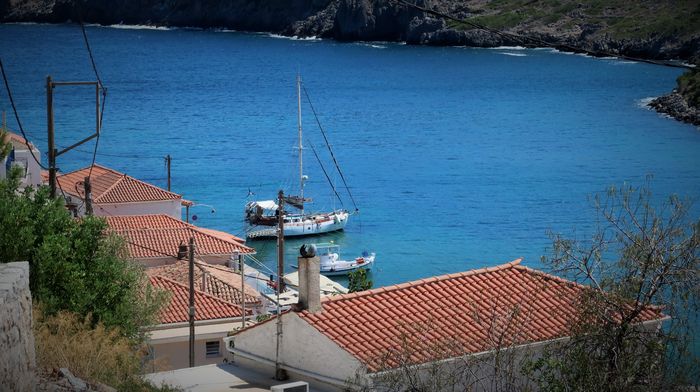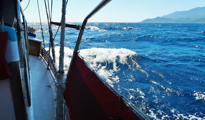 Med Port Sabatiki i ryggen drog vi upp seglen precis utanför hamnpiren. Strax utanför den skyddande udden vandrade vågorna i den friska vinden och det vita skummet yrde på böljornas toppar. Vi hade medvetet valt en dag med frisk vind för att få god skjuts på vår väg mot nästa mål. Med en fart på sex och en halv knop och vinden snett akterifrån så kände vi att dagens seglats skulle gå undan, men lyckan blev kortvarig. Redan efter någon timme avtog vinden. Samtidigt reste sig sjön och blev stökig och svallen rullade in från två olika håll och gjorde seglingen obekväm. Om vår babordssida låg havet öppet utan några skyddande öar och om styrbord låg kusten bergig och hård, med klippor som stupade ner i havets bränningar. Vinden vred sig ytterligare under dagen och vi tvingades längre ut från kusten. Att lägga seglen likt fåglars vingar ut åt två olika håll (segelsättningen kallas på engelska för ”wing on wing”) var inte möjlig i den gropiga sjön. Istället låg vi kvar på slör och vi slog på undanvind ett par tre gånger för att inte hamna fel. Göromålen ombord anpassades till mindre ansträngande sådana, vilket innebar att vi lyssnade på Sommar i P1. För en stund glömde vi bort havets eviga rullande. Ett par tillfällen fick vi möten där vi såg hur segelbåtarnas master pendlade från sida till sida likt taktvisande metronomer och vi slogs av tanken att havet denna dag liknade mer en kokande gryta än någonting annat. Men humöret var på topp trots båtens osymetriska rörelser. Sådana här seglingar får man emellanåt och vädret var ju trots allt soligt och högtrycksbetonat.