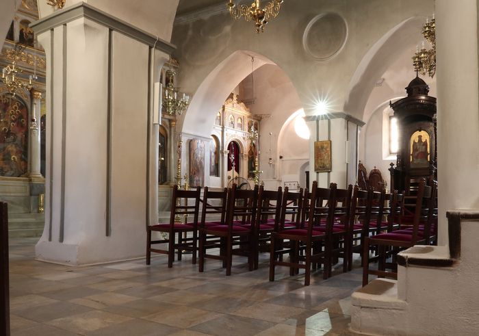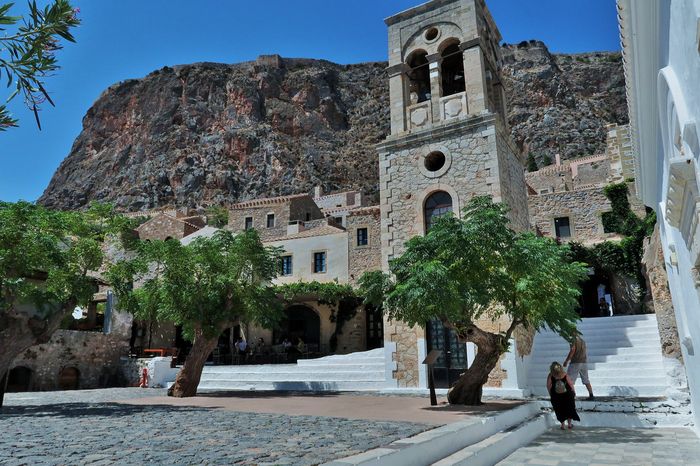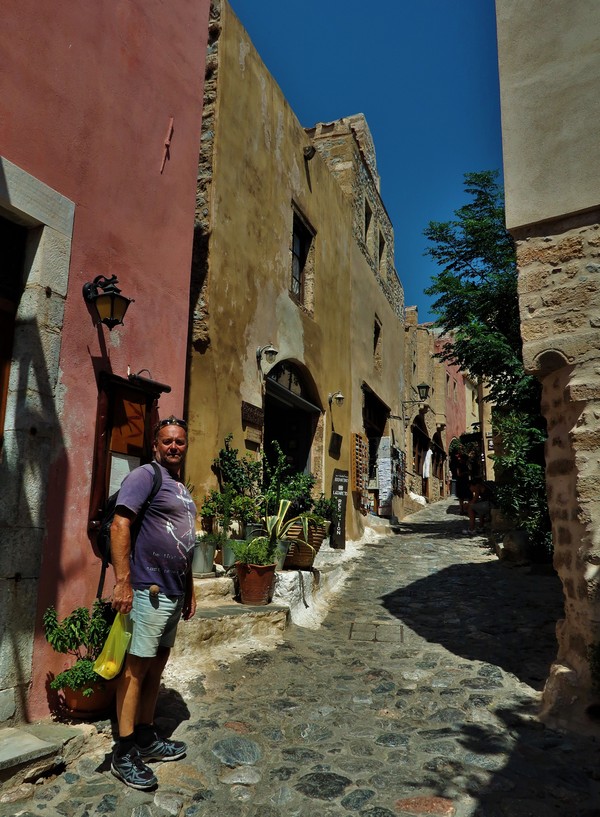 Dagen därpå när vi var utvilade och taggade så drog vi på oss varsin ryggsäck med kaffetermos, frukt och vatten. Att ta bussen bort till den bysantinska staden ute på klippan (den grundades på 500-talet) var inte att tänka på (vi behövde motionen). Väl framme finns inga bilvägar och innanför stadsmuren är man hänvisad att promenera oavsett. Namnet Monemvasia kommer från två grekiska ord, mone och emvasia som betyder ”en ingång”. Historiskt sett så har platsen varit betydelsefull där man ute på klippan skyddade sig från anfallande inkräktare genom sitt unika läge, fästning och mur. Idag går det en bro över till klippan och när den kom på plats 1971 började staden blomstra på nytt. Den gamla bebyggelsen inhyser idag små hotell, mysiga restauranger och boutiquer och husen har åter blivit bebodda. Men för den boende så kräver det att man är rätt pigg i benen för här är det på kullerstensgränder man tar sig fram vars stenar genom åren blivit polerade av skottkärror, åsnehovar och människofötter. När vi själva denna dag fick känna historiens vingslag under våra skor så var det genom att halka runt men snart blev vi skickliga på att se vilka stenar som var glashala och vi undvek dessa. Att gå hem från krogen i dessa kvarter görs lämpligen i hjälm och armbågsskydd blev vår analys, likaså torde benbrott vara den vanligaste åkomman på Monemvasias akutmottagning.