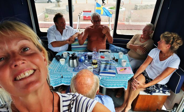 För att få en roligare kväll än att stå och mecka motor och felsöka så valde vi en umgängeskväll med våra vänner istället. Vi hade ju inte setts på flera veckor och de bjöd nu på drink i solnedgången samt en smarrig och väldoftande pastarätt till våra kurrande magars stora lycka. Smaker av finaste oregano och parmesan var precis vad vi behövde efter vår tillspetsade tilläggning. Men kvällen blev inte lång, vi behövde sömn och vi hade ju ett mystiskt larm att felsöka. Snart var vi tillbaka på Wilma.