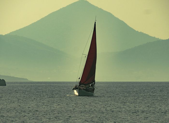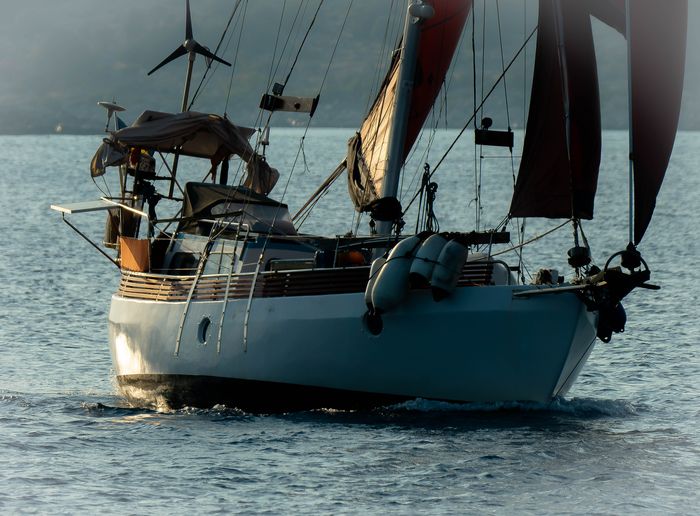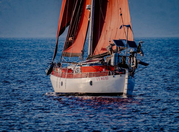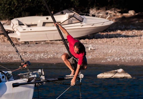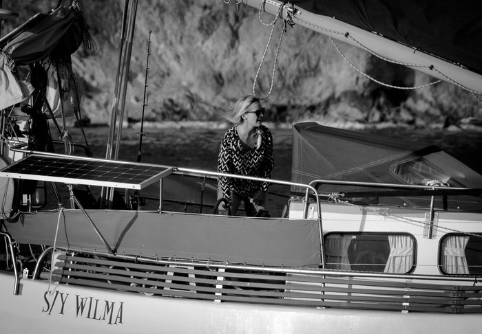 Det är inte varje dag man får sin båt fotograferad under färd. Glada drog vi ut seglet på nytt och några minuter senare passerade vi framför La Banda där Ulf sköt av bild efter bild. Med tre välfyllda segel lyckades vi undvika att segla in i land, inte heller krockade vi med någon av de andra ankrade båtarna. Efter passagen gjorde vi en kontrollerad gipp och styrde ut ur bukten och tog ner seglen för att åter gå in en andra gång – nu för att ankra.