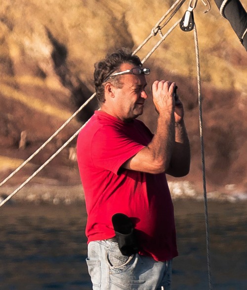 Styrman lutade sig ut över relingen för att kolla avgaserna, men det kom sjövatten precis som det skulle. Samtidigt lägger Kapten sin hand på avgaslimpan för att känna om den är ovanligt varm. Men tvärt om så var den inte alls särskilt varm, så inget konstigt där. Men trots att vi inte kunde finna något uppenbart fel så tjöt larmet oavbrutet. Kapten tog det snabba beslutet att vi inte behövde stänga av motorn på stört, utan att vi kunde ankra klart – om än lite hastigt.