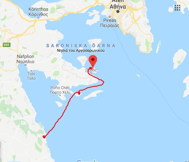 Nästa morgon sken solen som vanligt och under de efterföljande dagarna ägnade vi tiden åt trevliga umgängen och bunkring. Det var ju första gången vi var in till land på Poros men inte första gången vi var här. För några veckor sedan hämtade vi vår vän Konstruktören på Poros men den gången backade vi bara in till kaj och han fick hoppa ombord i farten, sen drog vi iväg på äventyr. Därför var det kul att se oss om denna gång. Poros gav oss lite av samma känsla som Naxos, trevligt men rätt så tillrättalagt för turister och med ett högre tempo. Här mötte vi våra österrikiska seglarvänner på S/Y Tiki, de som seglar en Colin Archer precis som vi. Vi hann även med lite sällskapsspel med Ulf och Kicki och för första gången så kom varken Kapten Betong eller Styrman Pimpsten på jumboplatsen (det tar sig som mordbrännaren sa). Vi blev även inbjudna på den svenska motorbåten Pegasus på en kopp svensk bryggkaffe och det smakade prima fint.
