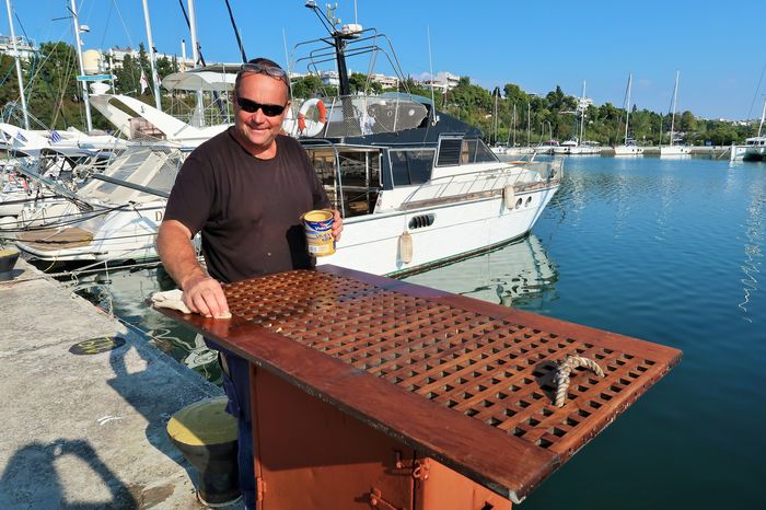 Väl tillbaka så var de två unga killarna tillbaka, deras båt gnuggade ju skrovsida med katamaranen precis som oss och lika trångt dessutom, på deras andra sida hade de en grekisk fiskebåt av rätt stöddigt mått. Katamaranens besättning var i land någonstans, de syntes inte till. Det hade börjat rulla lite så vi fyllde på med fendrar mellan oss och katamaranen. Vi fick trycka ner dem med kraft – så tajt var det. Nu låg vi tre båtar bredvid varandra som en bättre brittisk trekantssandwich, bara polackerna hade lite bättre svängrum vilket de säkert var glada och tacksamma för. Därefter klev vi ner i Wilma och gjorde en tidig kväll, vi hade ingen lust att stöta oss med den stroppiga italienaren utan föredrog på svenskt manér att hålla en låg profil.