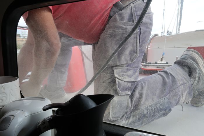När vi just somnat så kände vi hur det började dra och kränga i förtöjningarna, Wilma rullade från sida till sida och vi flög båda upp och ut. Våra blå förtöjningslinor är lite för stumma så vi ville lägga på de vita som är mer flexibla för att slippa de värsta rycken. Katamaranfolket syntes inte till men våra övriga båtgrannar stod på kajen och höll på att ändra sina tampar för att säkra sina båtar. Medan vi höll på så tilltog svallen och plötsligt så gungar alla båtarna likt pendlande metronomer, Wilmas mast och polackens dito är flera gånger väldigt nära varandra och det ser inte alls bra ut. Plötsligt hör vi två kraftiga smällar, PANG! PANG! Wilmas och katamaranens bådas räcken slår ihop och solpanelen på Wilma får sig en kyss. Kapten Betong svär högt över den italienske skepparen och säger flera gånger att ”hade han bara lyssnat så hade detta inte behövt hända”.