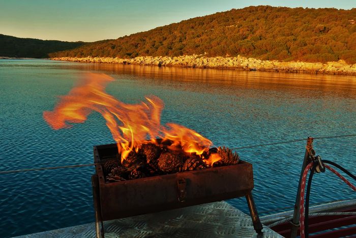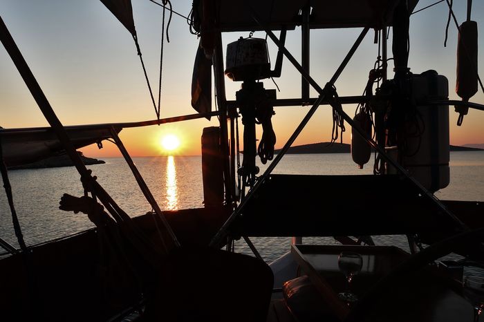 Nu ligger vi på Skantzoura, en isolerad och obebodd ö tjugo nautiska mil norr om Skyros. Det lär finnas en övergiven klosterruin på ön, men vi ser den inte från vår position. Skantzoura är ett tillhåll för den ovanliga rödnäbbade truten samt den utrotningshotade Eleonorafalken. På klipporna ser vi en handfull getter som går och betar, de har imponerande stora skägg och horn. Ön ingår i naturreservatet Alonissos Marine Park som bland annat arbetar för munksälens överlevnad. Det är strängt förbjudet att fiska här. Av en händelse så råkade vi även läsa att man endast får ankra upp en natt här, sen måste man segla vidare. Det står inget i sjökortet om det, utan vi råkade springa på informationen på internet under vårt andra dygn här. Aj aj aj…Marine Park sägs patrullera här men vi har inte sett till dem och i morgon seglar vi vidare. Vi tror vi klarar oss ifrån en utskällning.