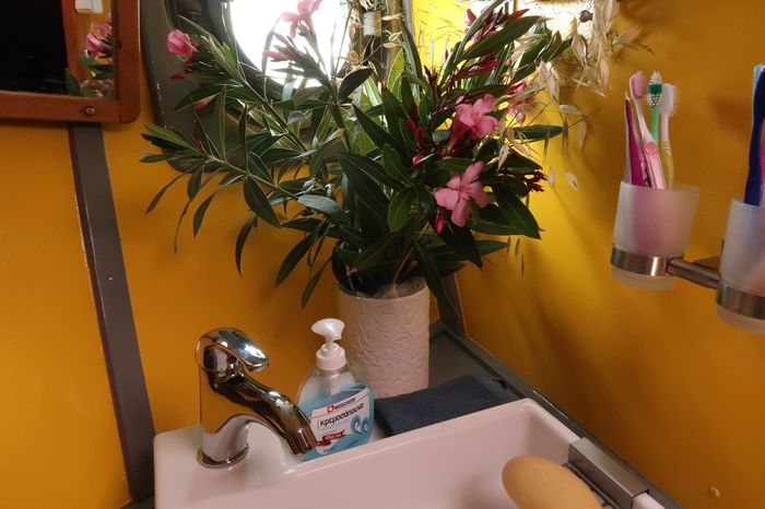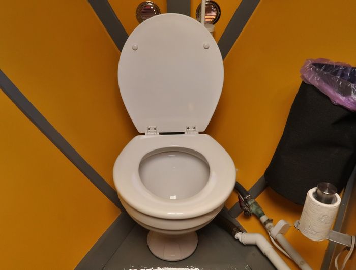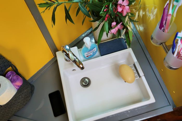 Nu kan vi presentera vårt ”coronabadrum”. Om det inte vore för pandemin, hade badrummet aldrig målats i knallgul kulört. Sannolikt hade en renovering inte ägt rum över huvud taget. Inte nu i vart fall. Men det ville sig inte bättre och något behövde vi ju göra med vår oväntade extratid vi fått på grund av den påtvingade isoleringen. Att det föll på badrummet berodde på att vi behövde täta uppe i taket, där skorstensröret går ut genom däcket. Det hade börjat leta sig in lite regnvatten i skarven, vilket kanske inte var så förvånande med Wilmas många år på nacken. Men steget därifrån till att renovera hela badrummet är rätt stor. När beslutet dock var taget, stod vi med nästa utmaning. Var köper man färg när alla butiker är stängda sånär som på matbutik, bensinmack och apotek. Men vi hade tur. Inne på macken stod några färgburkar på en av hyllorna; djupblå, spygrönt och knallgul. Därtill grå och svart. Valet föll på gul och grå. Sen gick vi till verket…