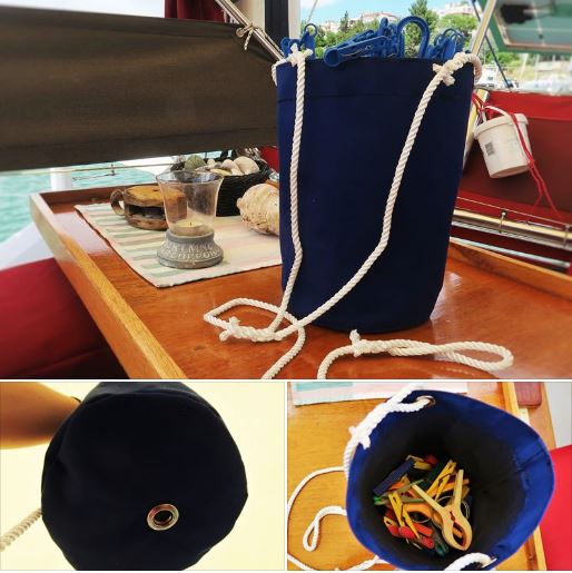 Ingen stor pryl, men ack så praktisk. En morgon när fru Styrman vaknade fick hon en present, en påse med ett hål i botten. Kapten hade sytt påsen för ändamålet att förvara klädnypor i. Slitstark och praktisk och skulle den glömmas kvar ute i regnet så rinner vattnet ur. Marin såklart med splitsade snören.