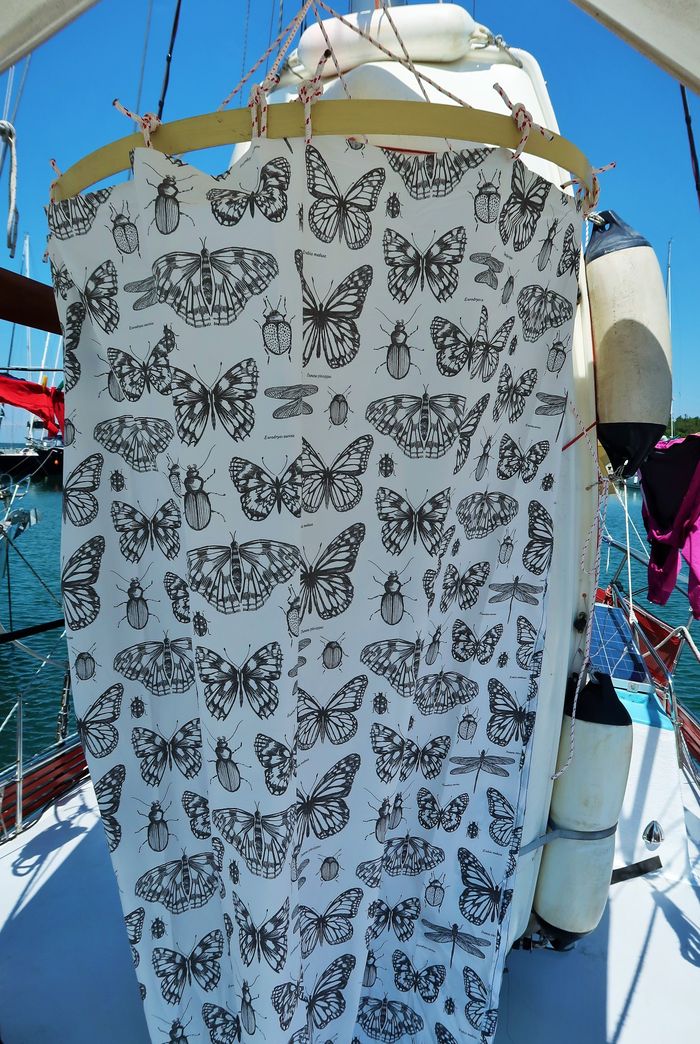Ja, det är betydligt bekvämare och mer praktiskt att duscha naken – än med kläderna på. Avståndet till närmaste båt i ankarviken är inte alltid så stort. För att slippa skämmas och skrämmas har vi nu ordnat ett drapperi så vi kan stå nakna därinne när vi vill duscha av oss Medelhavets salta vatten efter ett svalkande dopp i det blå. Duschdraperiet består av två stycken dito, som vi sytt ihop till ett. Draperistången består av en kasserad latta som vi räddade från sopcontainern. För den ovetande kan vi berätta att en latta, är en list som man styvar upp seglet med. Vi fortsätter med våra förbättringar ombord och dagen vi kastar loss rycker sig allt närmare.