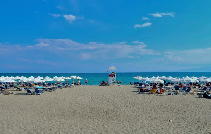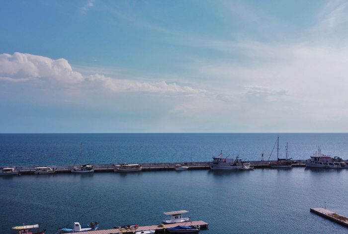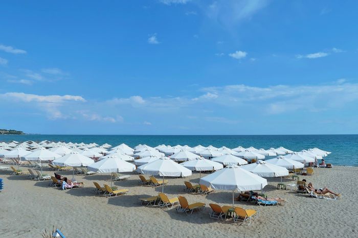 Det var här vi var i oktober, när pappa Felix checkade ut från jordelivet. Då regnade det och hela himlen grät med oss. Men nu har vi sol. Bortanför hamnen löper en lång badstrand med restauranger och hotell. Städat och betydligt mer välkomnande än hamnen vill vi lova. De slitna och ojämna trottoarerna vi promenerade på då var nu ersatta med en nylagd boulevard. Med hjälp av EU-bidrag håller Nea Kallikratia på att rustas upp. Hit kommer turister, främst grekerna själva som söker svalka undan heta Thessaloniki. Det kan bli rysligt varmt där, det blåser ofta inte så mycket i Thessalonikibukten. I övrigt är det främst slovener, bulgarer och ryssar som hittar hit till Nea Kallikratia.