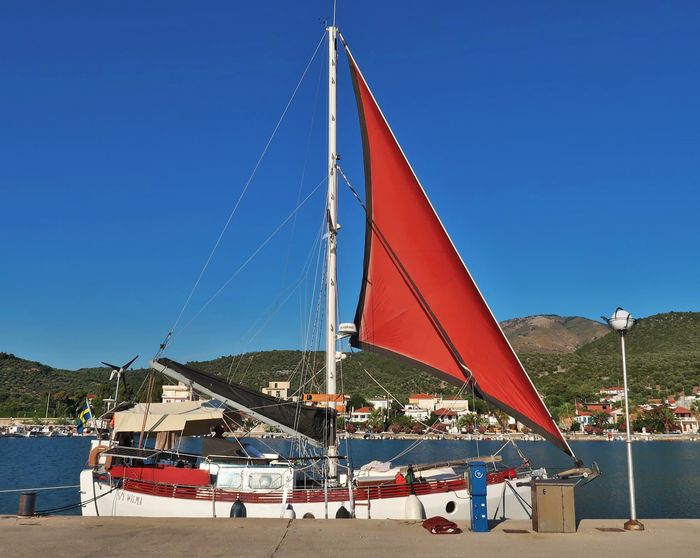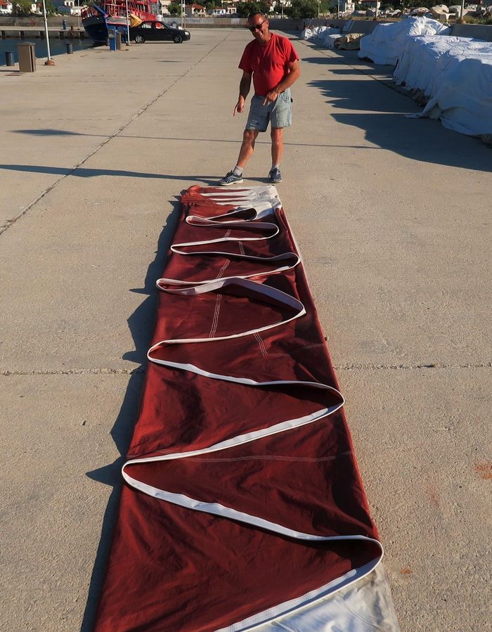 Vi förbereder Wilma för tuffare seglingar. Meltemin är den legendariska grekiska vinden som blåser från norr till söder. Det är inte ovanligt att färjor som trafikerar öarna i Egeiska havet får ställa in sina turer på grund av för mycket blåst, den hårda brisen kan snabbt övergå i kuling och blåsa över 20 m/s (8-9 Beaufort). Meltemivindarna beror faktiskt inte på dåligt väder – tvärt om, och den hårda brisen är intensivast i juli och augusti och särskilt hårt blåser det i de korridorer som skapas mellan öarna. Lite tungfotat uttryckt kan man säga att det blir ett sjujäkla vinddrag och havet yr av vitt skum. Förra sommaren hade vi några av våra bästa seglingar när vi korsade korridoren där Wilma ångade på som ett lokomotiv. Kvickt försvinner alla fritidsseglare och vi blir ensamma på havet. Wilma får äntligen sträcka ut och visa sin fulla potential. Ja, Wilma inte som andra båtar, men det har ni nog vid det här laget redan förstått.