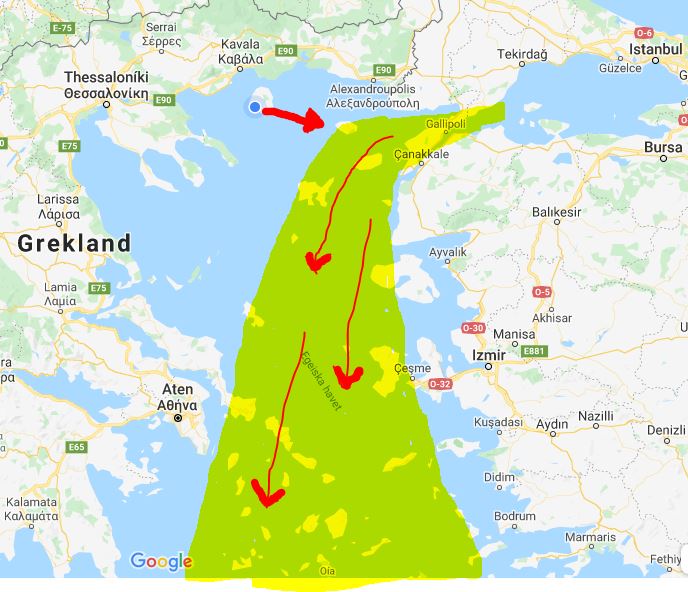 De sydliga vindarna är oftast mildare och då seglar vi helst med genuan (för er landkrabbor = genua är ett namn på försegel förutom en italiensk stad). Genuan har en större segelyta och fångar således bättre de lättare vindarna. Medan vi gör tvärt om i de hårda nordliga vindarna, då väljer vi ett mindre segel. Därför var det dags att skifta och häromdagen bytte vi till klyvaren. Snart är de lätta vindarnas tid över och vi ska ut i meltemistråket.