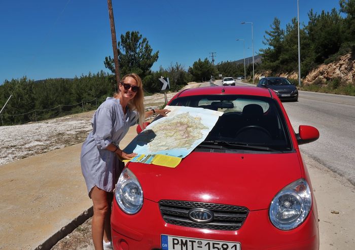 Efter samtalet med den unga kvinnan tog vi oss upp till hyrbilen som väntade invid vägkanten. Därefter kunde vår färd runt ön Thassos fortsätta, nu utan några incidenter tack och lov. Däremot avstod vi från längre promenader (Kapten hade ont i foten)