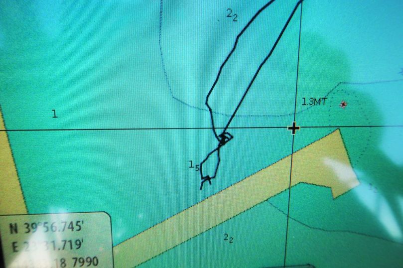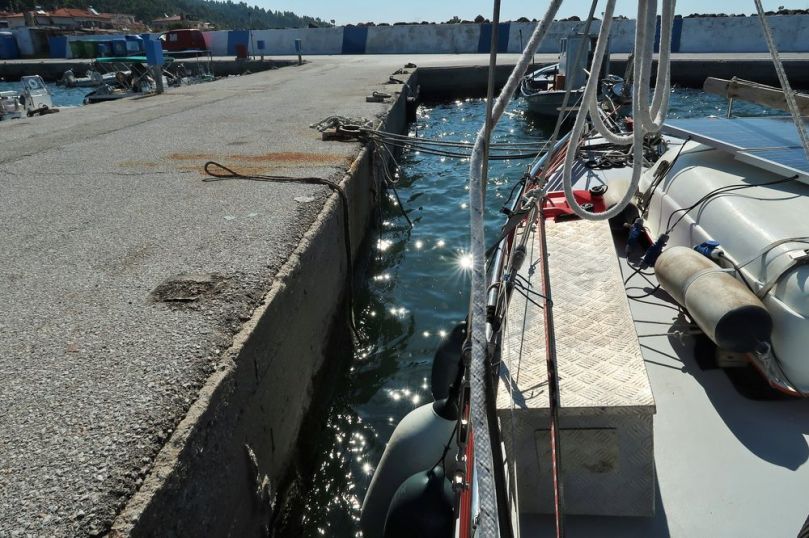 Efter drygt sjutton timmar på havet kunde vi äntligen styra in till den lilla fiskehamnen i Nea Skioni. Vi visste sen tidigare att hamnen var trång med få platser för gästande båtar, byns egna fiskare upptog större delen av kajremsan. När vi kommit runt hamnpiren såg vi att tre segelbåtar lyckats klämma in sig emellan, men någon plats för Wilma fanns inte. I bortre änden stack den gamla kajen ut, något sjavig och illa tilltygad låg den där mer eller mindre övergiven. Men angöringsringarna såg kraftiga ut i vart fall. Sjökortet visade ett fritt djup på 1,5 meter vilket nog var förklaringen till varför ingen båt lagt sig där. Med Wilmas djupgående på 1,90 kändes det som en dålig idé att ens försöka.