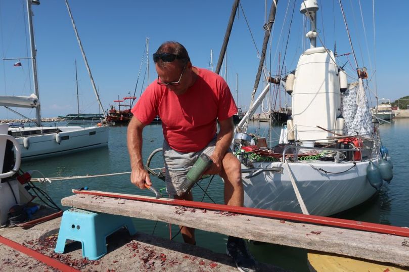 de som utgör Wilmas brädgång (som vi själva brukar kalla för staketet). Nu slipar Kapten de flagnade ribborna rena på färg och senare, när vi är uppe å land ska de målas. Killen som samordnar lyften kom förbi och mötet var lika glatt och skämtsamt