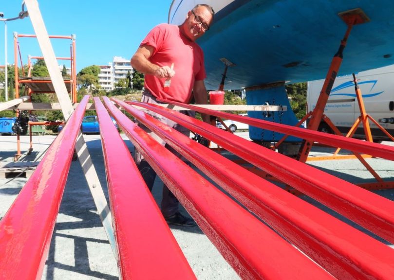 Despite the difficult situation, we are happy to take the chance to play a little. As with the middle part of the propeller shaft, the one we (to everyone’s surprise) cut in the middle and extended when we were on the shipyard in Lisbon. That time, we painted the shaft black. Now Captain Concrete got an idea. He thought it would be much more fun every time he open the engine hatch, to see a yellow engine and a red propeller shaft. Even if something on the engine is broken, you will feel more happy because of the happy colors. Even if it means more job to paint, it doesn´t bother Captain. Because now he is playing (and not working).