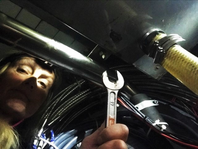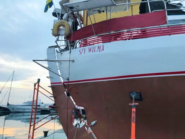 och efter kisses plötsliga nattbesök, väntade nu en dags borrande i Wilmas stenhårda skrov. Med Styrman Pimpsten på insidan i helveteshålet och Kapten på utsidan så kunde vi efter tjugofyra genomgående bult bedöma Wilma klar för sjösättning. Som ett
