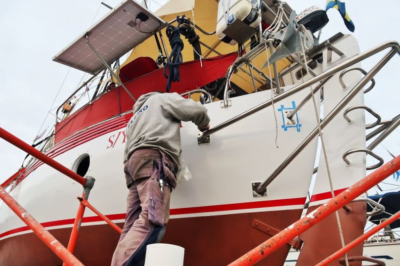 bättre modernt konstverk sitter nu vindroder-fästet på plats. Om allt går som det ska, kommer vi vara tillbaka i vattnet inom någon dag eller två. Sen behöver varken vi eller lilla kisse kliva på den branta stegen för att ta sig ombord. Fast fler