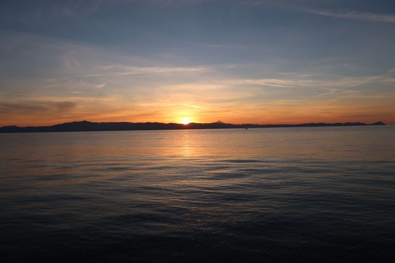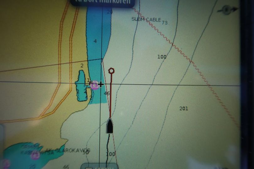 Ett halvhjärtat försök gjorde vi dock, men avbröt när vi insåg att vinden inte alls skulle stilla sig vid smalaste stället. Istället styrde vi Wilma mot en närbelägen bukt och droppade ankaret. Det fick duga.