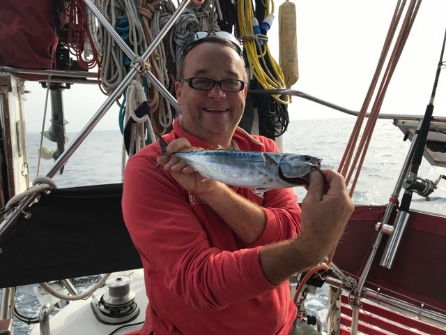 De jämna behagliga vindarna snett akterifrån höll i sig dryga dygnet, därefter dog vinden av. Tiden fram tills dess hade knatat på – med god fiskelycka som krona på verket. Kapten njöt av att äntligen få dra upp fin middagsmat ur havet (sent omsider