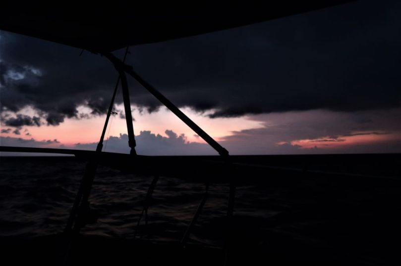det inte den natten, båda spejade och spanade efter åskan som nu låg på båda sidor om oss. Men allteftersom gav den med sig och strax före soluppgången började det blåsa friskt. Molnen skingrade sig och nu dansade Wilma fram med sex knops fart.