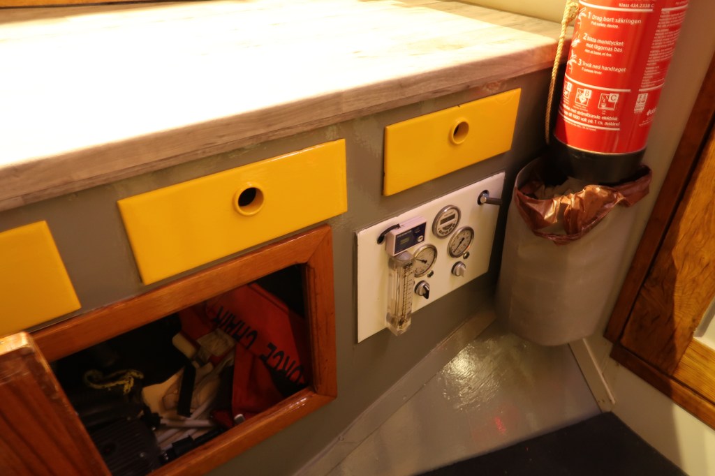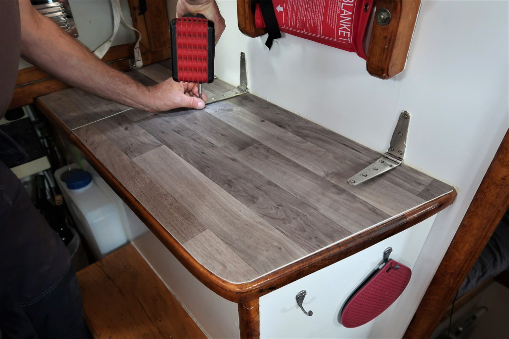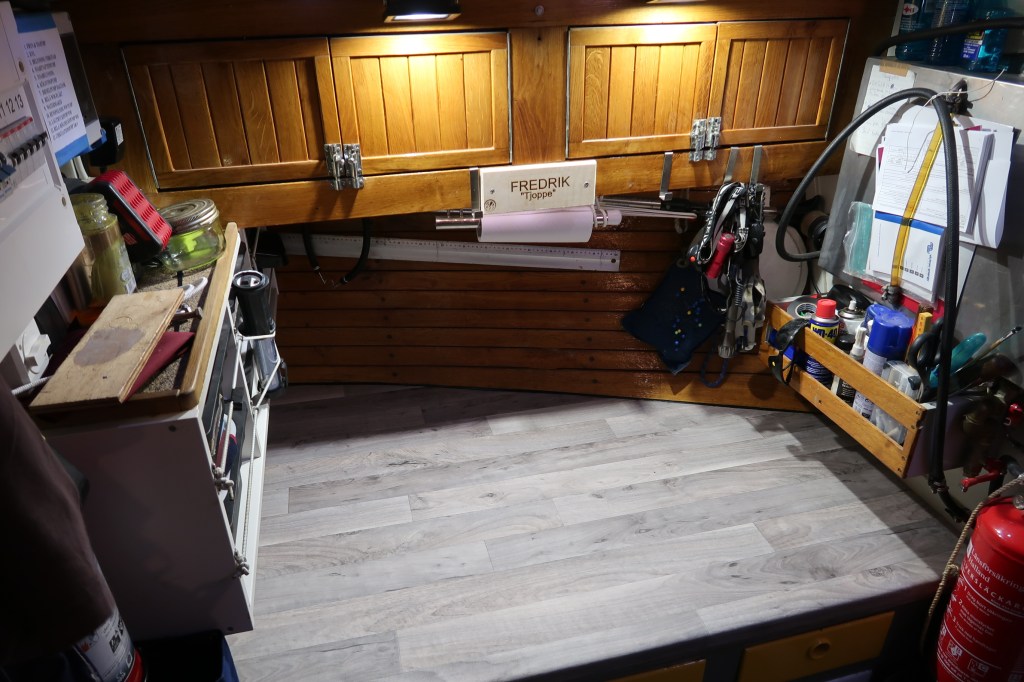 I övrigt lunkar dagarna på och vi sysselsätter oss med lite diverse. En dag provkörde vi utombordaren och den startade snällt utan krångel. Nu är även den klar för avgång. En annan dag gick vi upp på stan för att leta vinylmatta på metervara. Verkstadsbänken har nu fått en grå slitstark matta som ytskikt och likaså trappavsatsen vid nedgången till pilothuset. En dag tillverkade Kapten en banka-planka. En banka-planka undrar ni nu, vad är det för något? Det är precis vad det låter som. Emellanåt behöver man något hårt som underlag, när man ska stansa öljetter eller slå med släggan i största allmänhet. Trots att banka-plankan med tiden kommer bli bucklig och ful, ville han fräsa kanterna och olja in den. Nu är den fin och vi får se hur länge det varar. Oavsett tycker Kapten att om något ska göras, så ska det göras ordentligt.