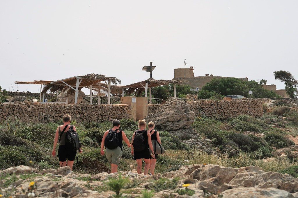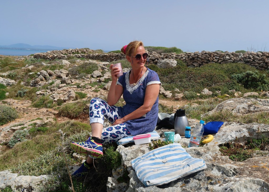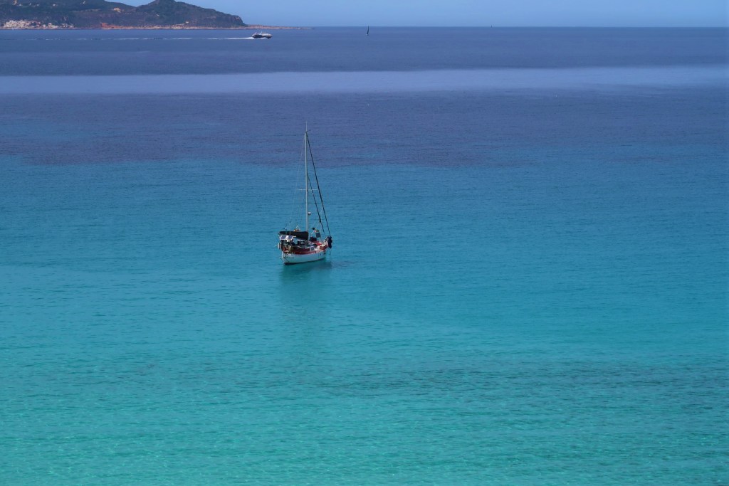 Vi sjösatte jollen och tog oss i land. Vi ville utforska ön lite bättre och samtidigt se om det gick att ta några bilder på Wilma där hon ensam guppade i det azurblåa vattnet. Med kaffetermos och frukt tog vi oss i land och gick en promenad. Fin ö, men förvånade vi blev när det plötsligt stod fyra danskor bredvid oss och blickade ut över havet. Väninnorna var på semester och nog såg vi något drömskt i deras blickar när vi berättade att Wilma (som de stod och beundrade) var vår båt. ”Har ni seglat hit från Sverige”. Jo, ja…det har vi, svarade vi med ett glatt leende. Tjejerna rekommenderade segling i Limfjorden och eftersom vi inte varit där, tog vi tacksamt emot förslaget. Men det blir inte nu. För nu ska vi segla till Sardinien!