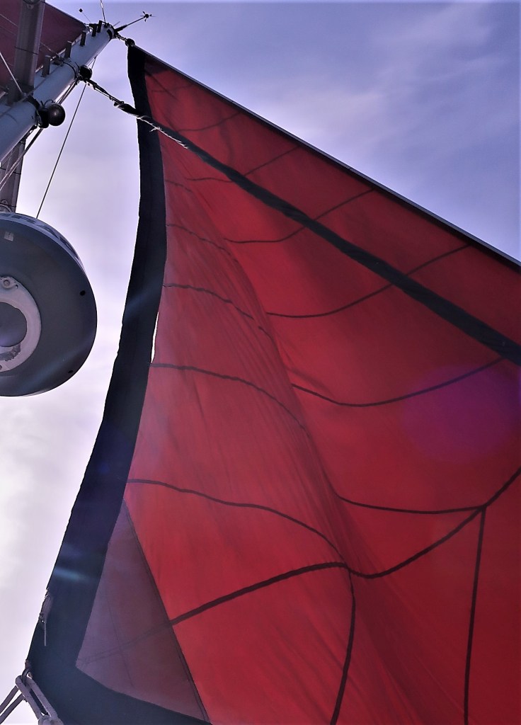 Solens strålar på baksidan av seglet avslöjar en reva. Parallellt med UV-skyddet i själva segelduken har tyget gett med sig och gissningsvis hände det under den hårda seglingen mellan Tunisien och Italien. Särskilt upprörd blev inte Kapten, för seglet (en klyvare och vårt absoluta favoritsegel) har hängt med länge, ända sedan pappa Felix köpte det på 80-talet, för snart 40 år sedan. Ingen dålig kvalitet med andra ord och någon dag tar ju livet slut, även för ett segel.
