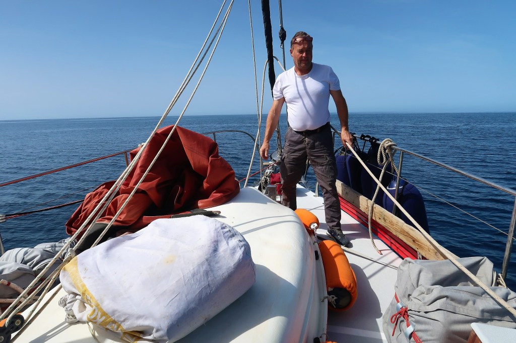 Sakta vände vinden på Wilma så hon drev ut från kusten. För att få lite bättre fart och inte riskera att hon gick upp i vind, började vi med att dra ut förseglet. Först med bättre fart hissade vi (på undanvind) storseglet. Allt var frid och fröjd och nu hade vi att försöka navigera oss runt ön Favignana, innan vi skulle nå de rätta vindarna. Kapten gick fram på däck och blickade ut över det fria. Solen sken och havet glittrade i skiftande färger. Vilken härlig dag. Ett djupt friskt andetag och plötsligt fastnar Kaptens blick på förseglet, en åtta meter upp. ”MEN VA FAN ÄR DET HÄR????