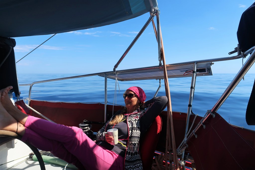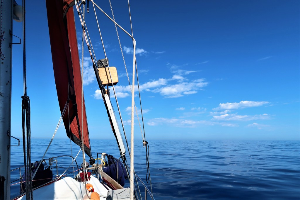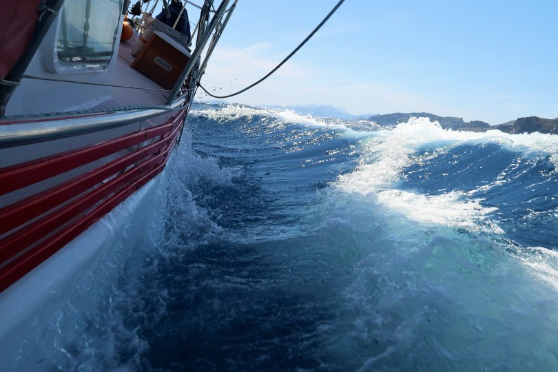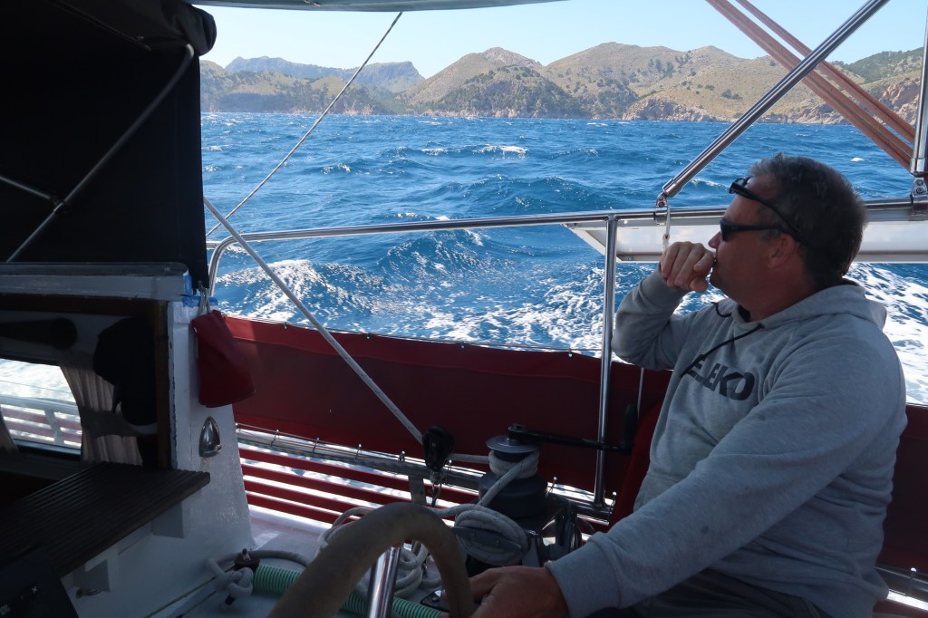 Havet låg till en början blankt. Vilken fantastisk dag på havet. Eftersom vi gick för motor passade vi på att tillverka dricksvatten och det blev även en dans med dammsugaren genom båten. När sedan de utlovade medvindarna kom, stängde vi av motorn och började segla. Till en början lite långsamt då vinden var måttlig till att på slutet få rejäl skjuts på havet. Wilma sköt fram som en frustande tjur och gjorde närmare nio knop när vindmätaren noterade över 14 meter per sekund (28 knots wind). Seglingen var skulle man kunna säga, frisk och sportig – och Wilma hävdade sig gott mot de få andra segelbåtarna som även de var på insegling till Pollenca. Eftersom de hade revat, men inte vi.