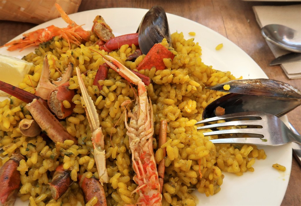 Språkliga barriärer gjorde att vi valde ”dagens erbjudande”. Vilket bestod av förrätt, varmrätt och efterrätt, vatten och vin för prisvärda 120 kronor per person. När förrätten, en paella, kom in på bordet – höll vi på att baxna. Portionerna var så grymt stora, att de gott och väl hade mättat grandiosa bodybuildare. Till varmrätt serverades panerad fisk med pommes och sås av obestämd sort. Lite trixigt var det med förståelsen, då all information var på spanska. Men det smakade bra. När vi därefter satt i oss chokladmousse och vispgrädde, trodde vi att vi skulle spricka.