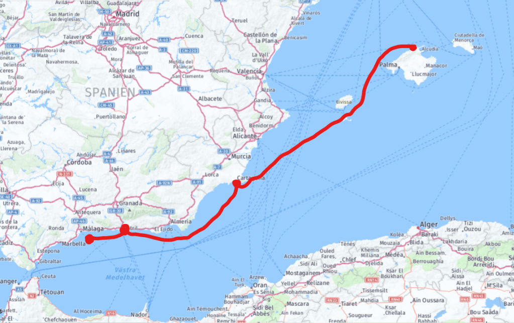 Därför stannade vi inte när vi kom fram till nästa ö Ibiza. Inte heller stannade vi när vi kom till ön Formentera. Dels hade det blivit mörkt så lusten att leta upp en ny ankringsplats kändes typ som noll. Därefter rådde kanske en hundra distans av idel vatten. Men seglingen gick som en dröm, så vi fortsatte. Vid något tillfälle halvvägs mellan Balearerna och spanska fastlandet passerade vi platsen där vi för fyra år sedan blev bordade och rammade av migranter. Det blev en man-över-bord-situation med herre-jösses räddningsaktion som följd, den gången. Helikopter och SAR-båt. Men ingen dog. När vi nu passerade platsen höll vi ett extra vakande öga ut över havet. Men allt var lugnt. Och havet var snällt.
