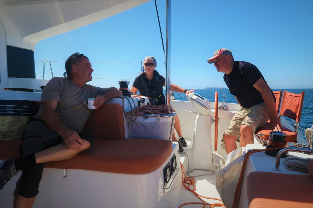 Med en yta motsvarande tre enskrovs-båtar är en katamaran rymlig och otroligt lättdriven. Båten lutar inte, vilket känns suspekt. Och umgängesytorna är så väl tilltagna att det känns lite läskigt att korsa dem. Instinktivt letar vi efter något att hålla oss i (fast det inte behövs) och oroligt sneglar vi åt varje kopp, glas och kastrull som lämnats utan surrning (vilket inte heller behövs, eftersom de inte kasar iväg). En rak och upprätt värld på havet med så mycket bekvämlighet, är vi inte vana vid.