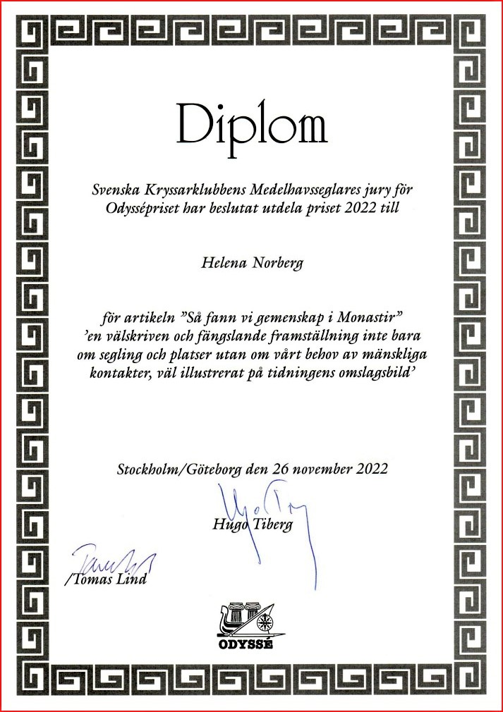 Motgångarna skulle snart visa sig växla över till medgångar. När Styrman gick in på sin mejl, fann hon ett meddelande från Svenska Kryssarklubben. Det första hon läste var ”GRATTIS”. Av mejlet framgick att en av hennes artiklar hade blivit utsedd till årets bästa – och för det hade hon blivit tilldelad årets Odyssépris. Nu var träningsvärken totalt glömd och stolt ropade hon på Kapten som stod ute och bockade plåt till dysan.
