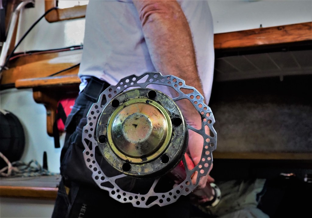 En dag tog vi (och Konstruktören) cyklarna bort till färjeläget i Seixal. Vi hoppade på en snabbgående katamaran – över floden Tejo, in till Lissabon. Efter en trevlig lunch och promenad, sökte vi upp en cykelaffär. Försäljaren tyckte nog vi var konstiga när vi på hans fråga svarade att bromsen inte alls var till en cykel, utan till en båt. Efter en stunds fundering föll valet på en mountainbike-broms. ”Vi tar två, tack” och nu såg killen än mer förundrad ut. Vi betalade och lämnade butiken med bromsskivor, bromsbelägg och vajrar. Nu hade vi vad som krävdes, för att bygga oss en propelleraxel-broms.