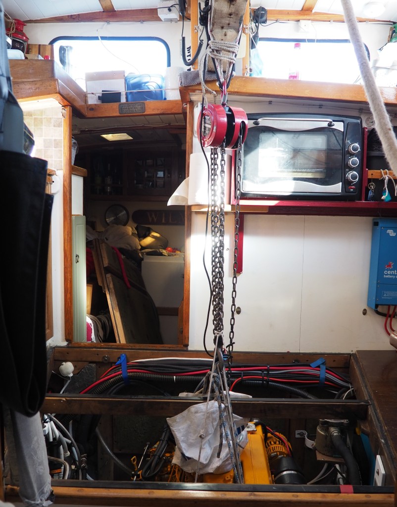 Vi behövde få misströsta, därför stängdes locket till motorrummet så vi slapp se eländet. Men efter att ha sovit några nätter på saken, började vi titta på möjligheterna att bygga om motorbädden. Billigast var ju onekligen att behålla det felbeställda backslaget. Så vi bestämde oss för att kavla upp ärmarna och ta itu med uppgiften. Vi måttade och mätte, därefter hämtades en rejäl stock. Stocken placerade vi mellan det aktre skottet och navigationsbordet (vilken tur att pappa Felix byggde Wilma i betong och massiv ek). Med motorrummet blottat kunde vi därefter hissa upp motorn i ett kättingspel.