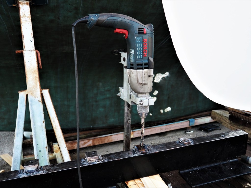 Järnbalkarna (som motorn står på) monterades bort och svetsen åkte fram. Under arbetets gång testade vi motorns placering provisoriskt några gånger, vilket blev ett tidsödande jobb. För bultarna satt trångt. När Kapten inte kom åt, fick Styrman ta vid. Ibland försvann hon ner vid transmissionssidan. Ibland låg hon under motorn.